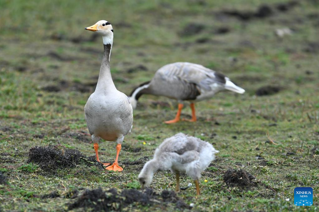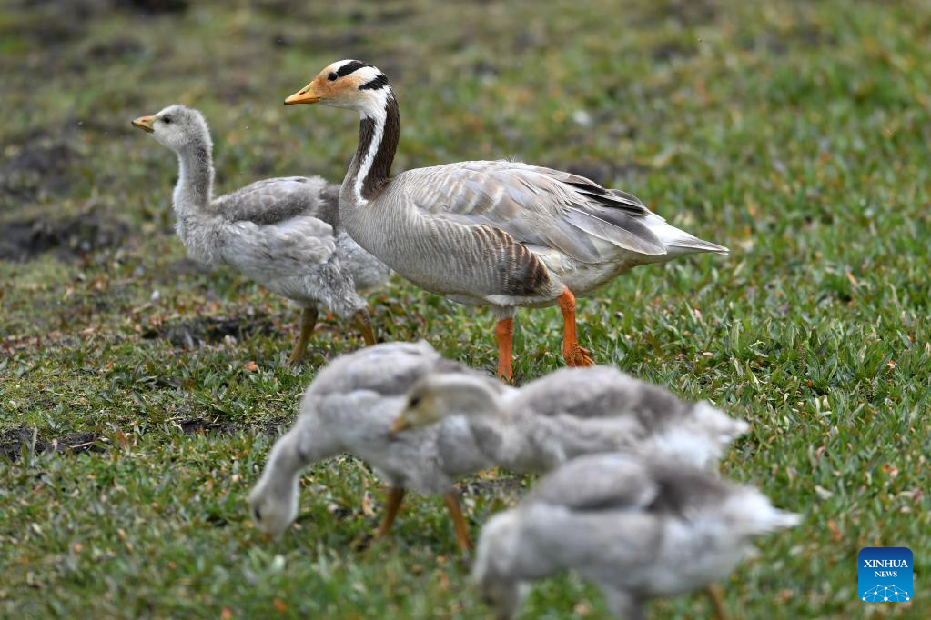 Chicks of bar-headed goose are pictured in the Gahai Lake wetland in Luqu County of the Tibetan Autonomous Prefecture of Gannan, northwest China's Gansu Province, July 7, 2023. (Xinhua/Chen Bin)
