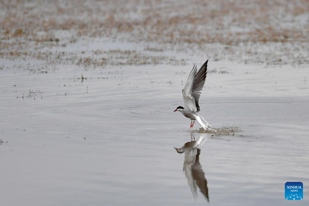 A tern forages on the Gahai Lake wetland in Luqu County of the Tibetan Autonomous Prefecture of Gannan, northwest China's Gansu Province, July 7, 2023. (Xinhua/Zhang Keren)