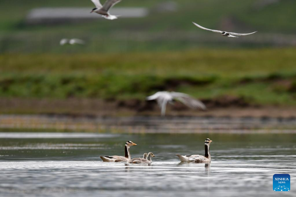 Bar-headed geese are pictured in the Gahai Lake wetland in Luqu County of the Tibetan Autonomous Prefecture of Gannan, northwest China's Gansu Province, July 7, 2023. (Xinhua/Zhang Keren)