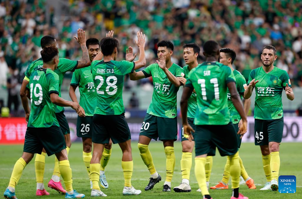 (230708) -- BEIJING, July 8, 2023 (Xinhua) -- Wang Ziming (5th R) of Beijing Guoan celebrates after scoring with teammates during a 2023 season Chinese Football Association Super League (CSL) 15th round match between Beijing Guoan and Shenzhen FC at Workers' Stadium in Beijing, capital of China, July 8, 2023. (Xinhua/Wang Lili)