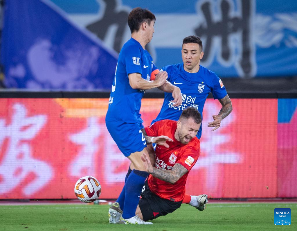 Ren Hang (L) of Wuhan Three Towns vies with Peter Zulj (bottom R) of Changchun Yatai during a 2023 season Chinese Football Association Super League (CSL) 15th round match between Wuhan Three Towns and Changchun Yatai in Wuhan, central China's Hubei Province, July 8, 2023. (Xinhua/Wu Zhizun)