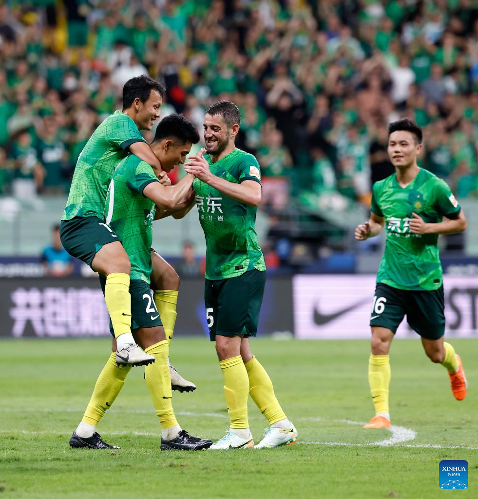 (230708) -- BEIJING, July 8, 2023 (Xinhua) -- Wang Ziming (2nd L) of Beijing Guoan celebrates after scoring with teammates during a 2023 season Chinese Football Association Super League (CSL) 15th round match between Beijing Guoan and Shenzhen FC at Workers' Stadium in Beijing, capital of China, July 8, 2023. (Xinhua/Wang Lili)