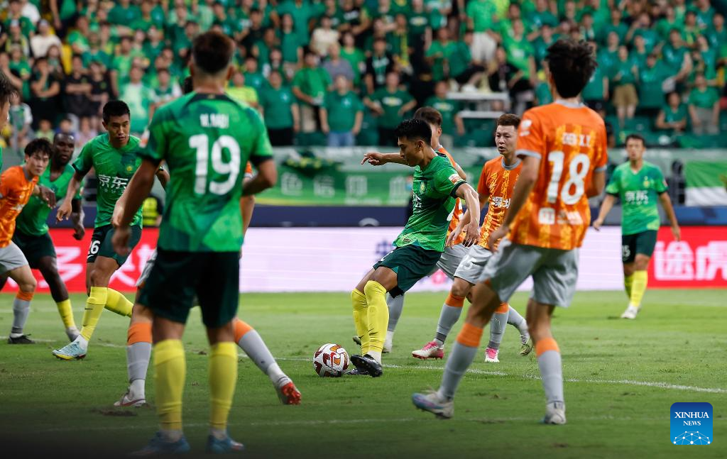 (230708) -- BEIJING, July 8, 2023 (Xinhua) -- Wang Ziming (C) of Beijing Guoan shoots to score during a 2023 season Chinese Football Association Super League (CSL) 15th round match between Beijing Guoan and Shenzhen FC at Workers' Stadium in Beijing, capital of China, July 8, 2023. (Xinhua/Wang Lili)