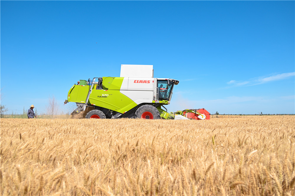 A harvester reaps wheat in Xiaotuguli village, Ershilidian township in Hutubi county, northwest China's Xinjiang Uygur Autonomous Region. (Photo/Tao Weiming)