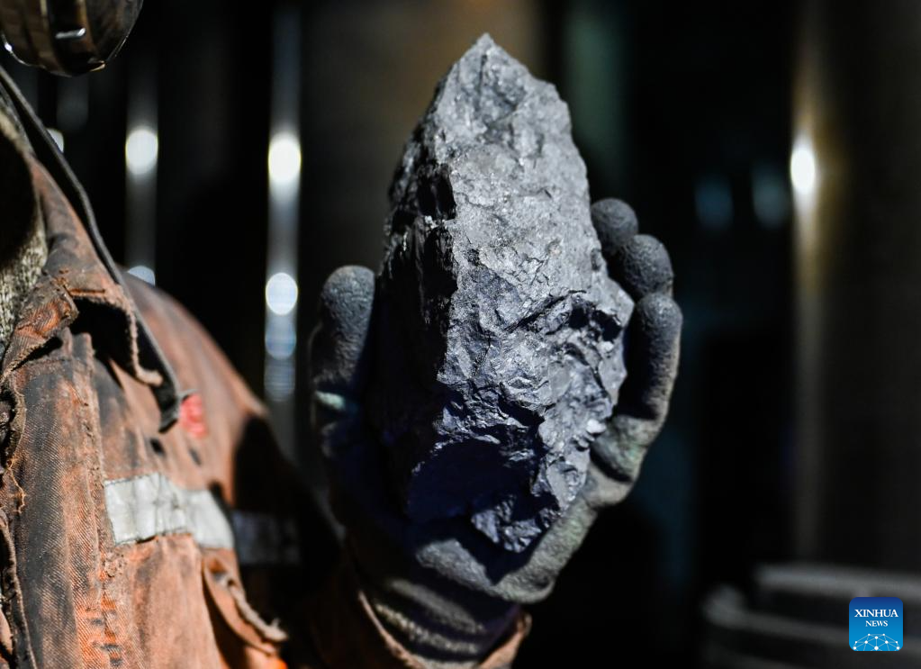 A staff member demonstrates a piece of coal at the Longwanggou Coal Mine of China Datang Corporation Ltd. in Jungar Banner, north China's Inner Mongolia Autonomous Region, July 8, 2023. (Xinhua/Liu Lei)