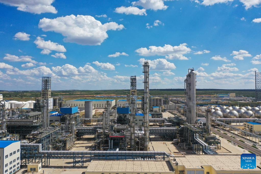 This aerial photo taken on July 8, 2023 shows the Jiutai new material technology corporation in Jungar Banner, north China's Inner Mongolia Autonomous Region. (Xinhua/Liu Lei)