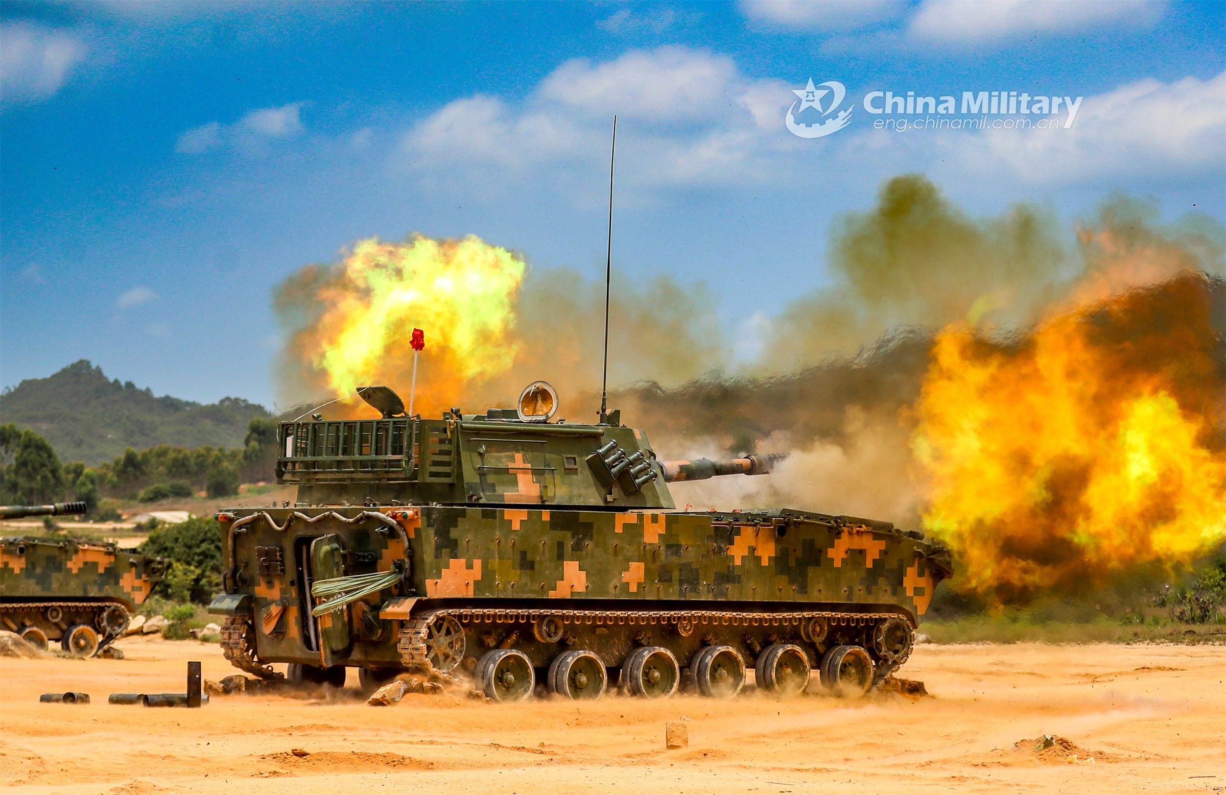 Armored vehicles attached to an artillery detachment with a brigade under the PLA 74th Group Army fires down range at mock targets during a live-fire test in the end of June, 2023, aiming to inspect the troops' precision strike capability. (eng.chinamil.com.cn/Photo by Li Bin)