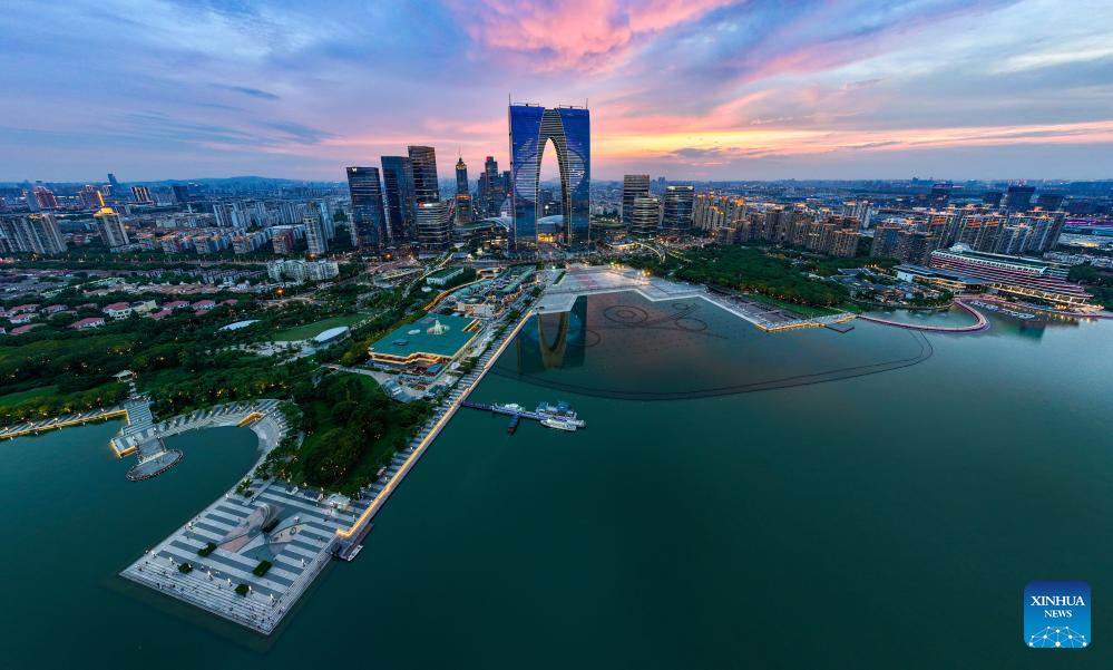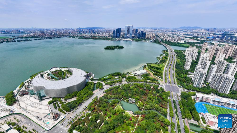This aerial photo taken on July 4, 2023 shows a view by the Jinji Lake in Suzhou, east China's Jiangsu Province. Suzhou, a city with a history of over 2,500 years, is referred to as heaven on earth in a famous Chinese adage. (Xinhua/Li Bo)