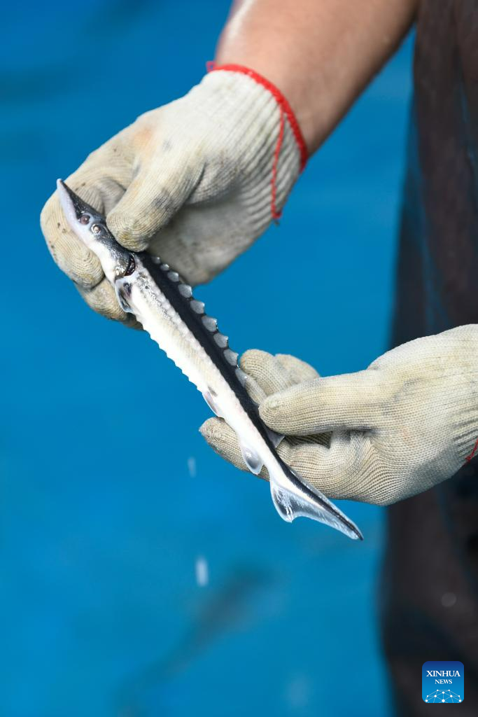 Zhou Liang checks juvenile fish of Yangtze sturgeon at a breeding base jointly operated by Yibin Institute of Rare Aquatic Animals and Fisheries Institute of Sichuan Academy of Agricultural Sciences in Yibin, southwest China's Sichuan Province, June 27, 2023. (Xinhua/Wang Xi)