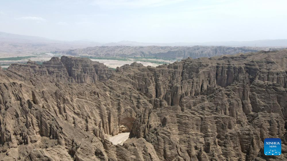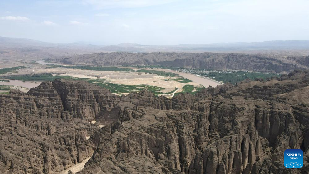 This aerial photo taken on July 11, 2023 shows a view of the Yellow River Stone Forest Scenic Spot in Jingtai County of Baiyin City, northwest China's Gansu Province. Yellow River Stone Forest Scenic Spot is famous for the view of the Yellow River, stone stalagmites, stone pillars, dessert as well as oases. (Xinhua/Chen Bin)