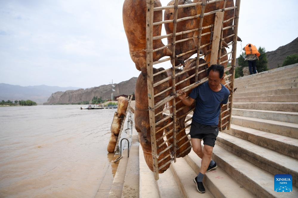 A ferry man carries a sheepskin raft as he prepares for rafting at the Yellow River Stone Forest Scenic Spot in Jingtai County of Baiyin City, northwest China's Gansu Province, July 11, 2023. Yellow River Stone Forest Scenic Spot is famous for the view of the Yellow River, stone stalagmites, stone pillars, dessert as well as oases. (Xinhua/Chen Bin)