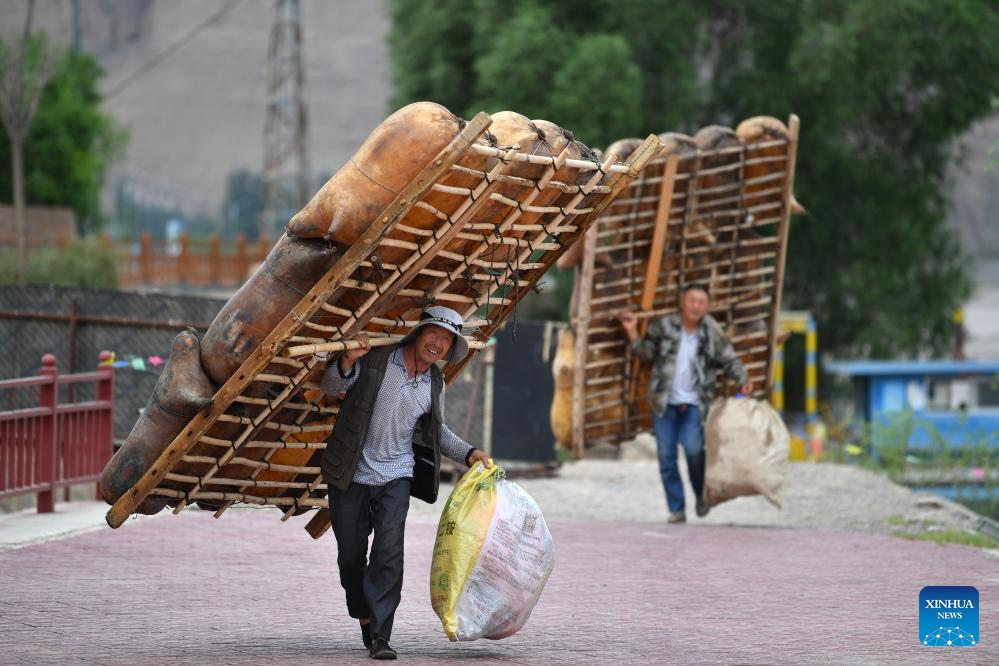 Ferry men carry sheepskin rafts for rafting at the Yellow River Stone Forest Scenic Spot in Jingtai County of Baiyin City, northwest China's Gansu Province, July 11, 2023. Yellow River Stone Forest Scenic Spot is famous for the view of the Yellow River, stone stalagmites, stone pillars, dessert as well as oases. (Xinhua/Zhang Keren)
