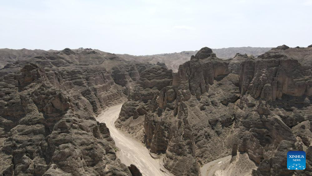 This aerial photo taken on July 11, 2023 shows a view of the Yellow River Stone Forest Scenic Spot in Jingtai County of Baiyin City, northwest China's Gansu Province. Yellow River Stone Forest Scenic Spot is famous for the view of the Yellow River, stone stalagmites, stone pillars, dessert as well as oases. (Xinhua/Zhang Keren)