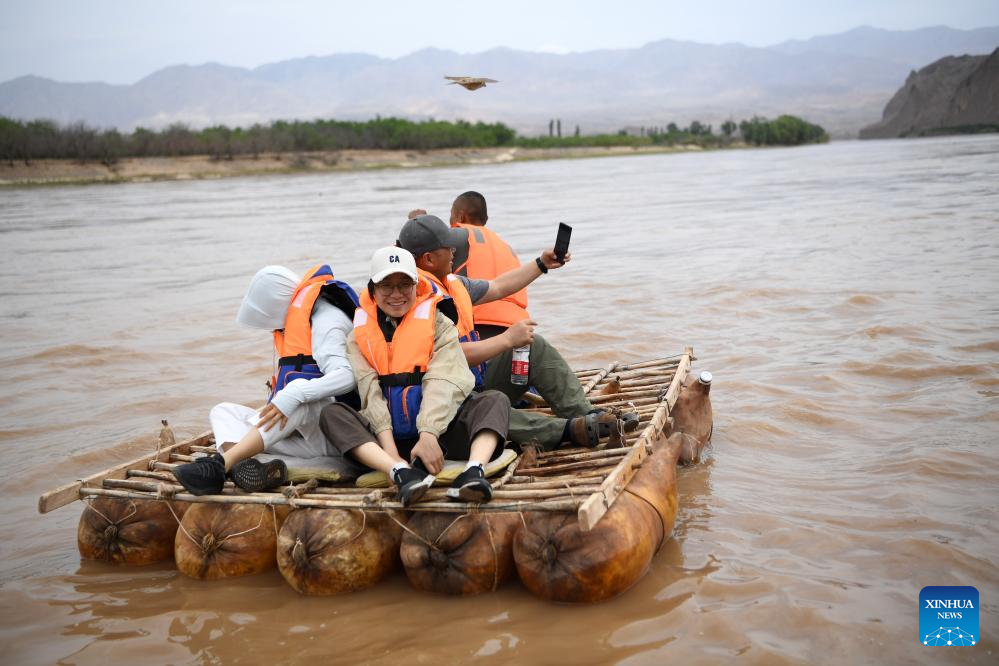Tourists experience sheepskin rafting at the Yellow River Stone Forest Scenic Spot in Jingtai County of Baiyin City, northwest China's Gansu Province, July 11, 2023. Yellow River Stone Forest Scenic Spot is famous for the view of the Yellow River, stone stalagmites, stone pillars, dessert as well as oases. (Xinhua/Chen Bin)