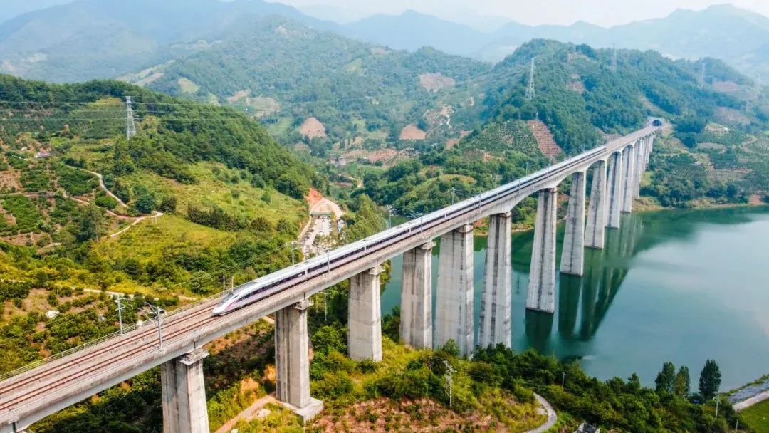The bridge over the Xingfuyuan reservoir, which the train was passing through in the video, is located 1.5 kilometers southeast of the Yangshuo high-speed railway station. It offers views of rolling mountains and turquoise waters.