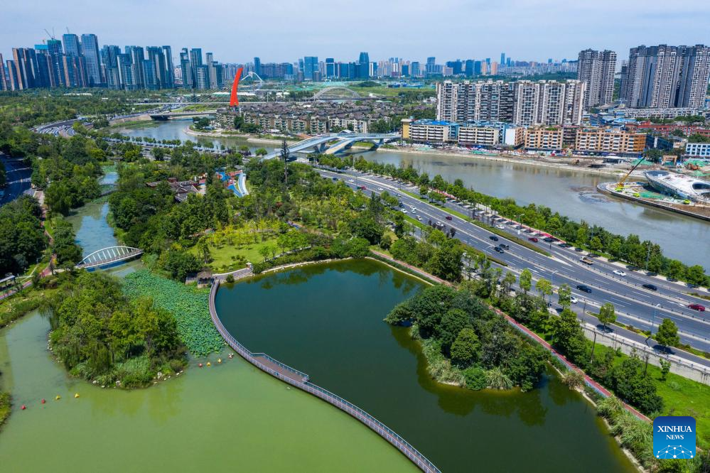 This aerial photo taken on June 23, 2023 shows an artificial wetland at the Huoshui park along the Fuhe River in Chengdu, capital of southwest China's Sichuan Province. (Xinhua/Jiang Hongjing)