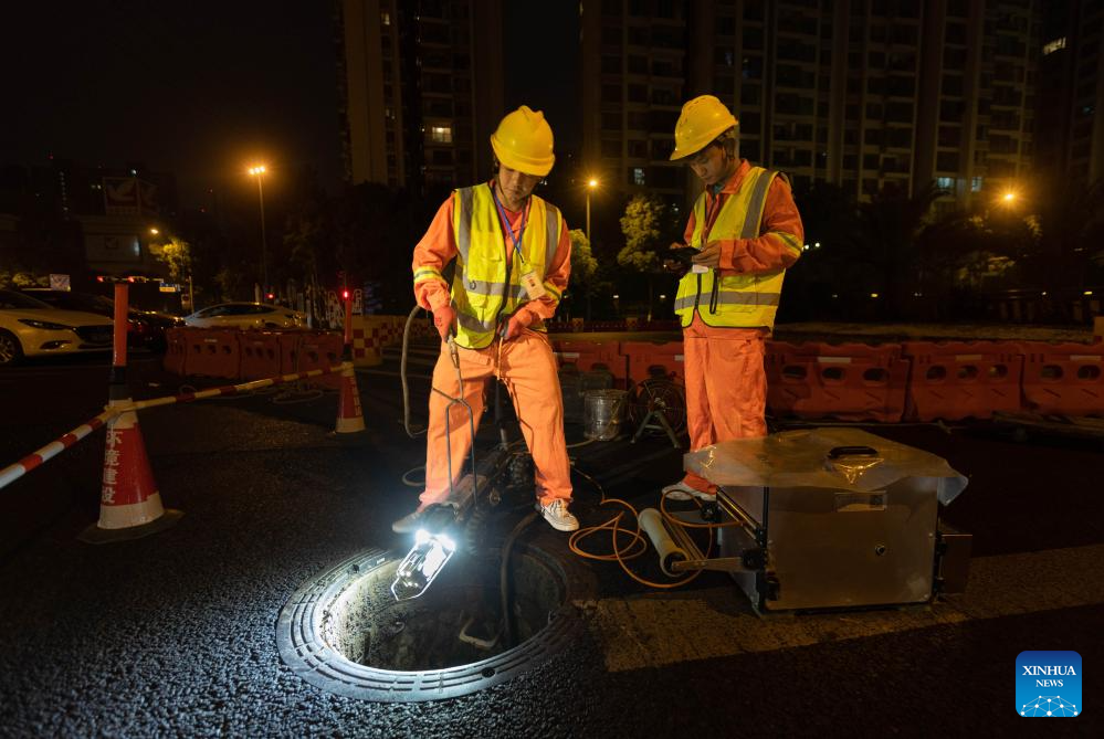 Staff members puts a testing robot into a sewage pipeline in Chengdu, capital of southwest China's Sichuan Province, June 16, 2023. (Xinhua/Jiang Hongjing)