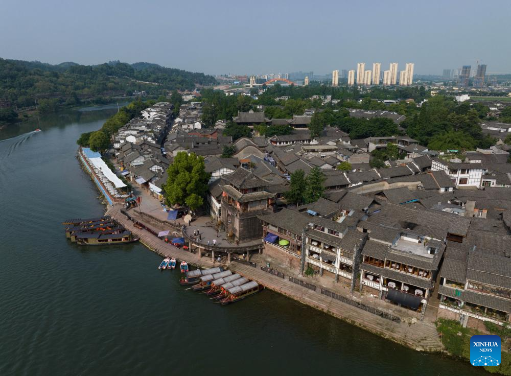This aerial photo taken on June 24, 2023 shows a dock at the Huanglong creek ancient town in Chengdu, capital of southwest China's Sichuan Province. (Xinhua/Jiang Hongjing)