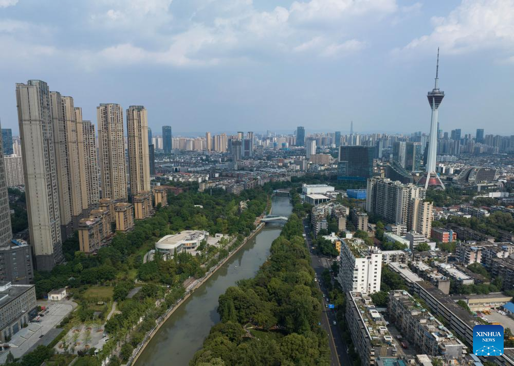 This aerial photo taken on June 23, 2023 shows residential buildings along the Xuyan River, a tributary of Jinjiang River, in Chengdu, capital of southwest China's Sichuan Province. (Xinhua/Jiang Hongjing)