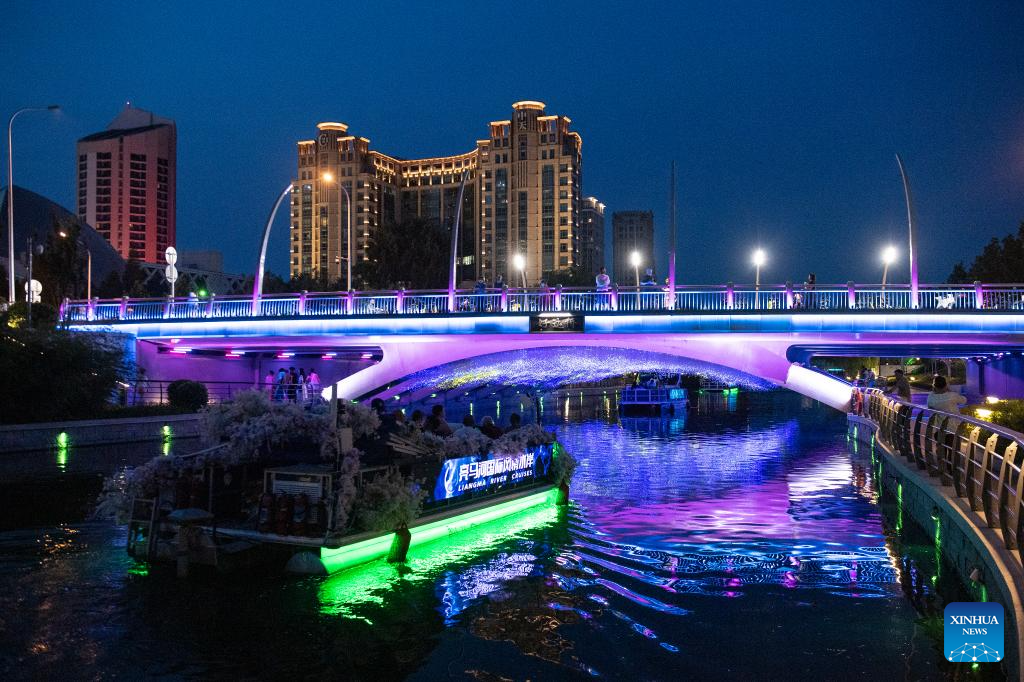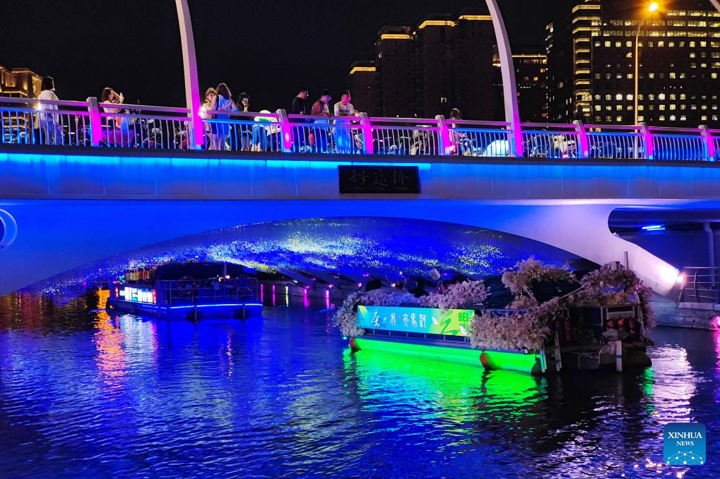 Tourists take an evening tour along the Liangma River in Beijing, capital of China, June 14, 2023. (Xinhua/Ju Huanzong)