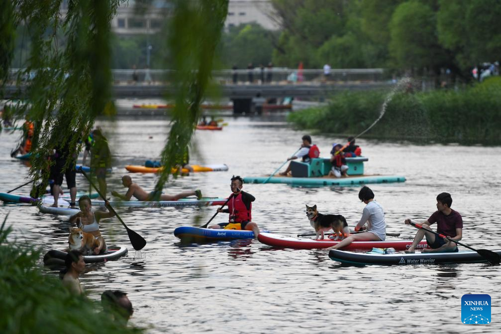 People enjoy paddleboarding on the Liangma River in Beijing, capital of China, June 23, 2023. (Xinhua/Ju Huanzong)