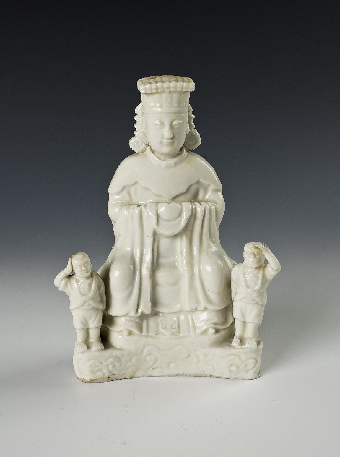 The statue is made of white and delicate porcelain and a bright and smooth layer of glaze, with the glaze sparkling with a slight yellow tinge. It depicts the scene of Mazu sitting upright in a grand gown and with a square flat-topped crown on her head, vividly showing the sea goddess' solicitude for people making a living on the sea.