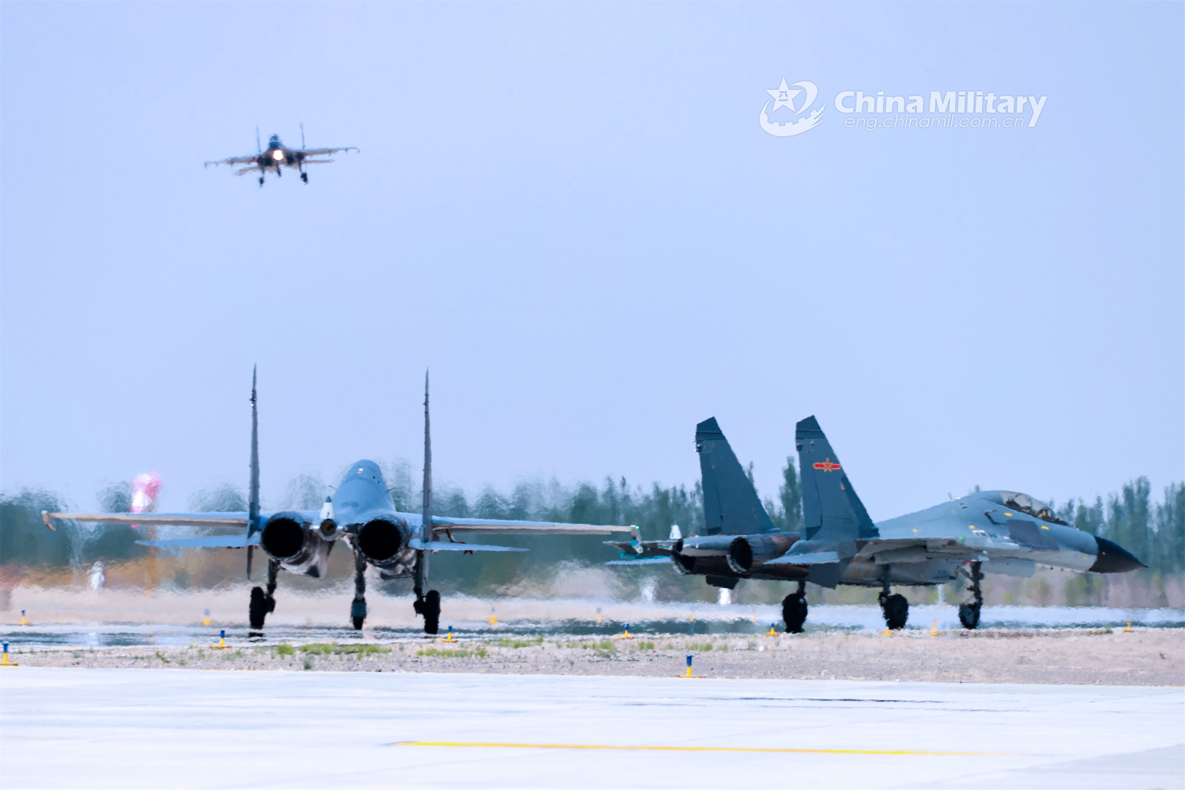 Fighter jets attached to an aviation brigade of the air force taxi down the runway after landing during a flight training exercise in late June, 2023. (eng.chinamil.com.cn/Photo by Cui Baoliang)