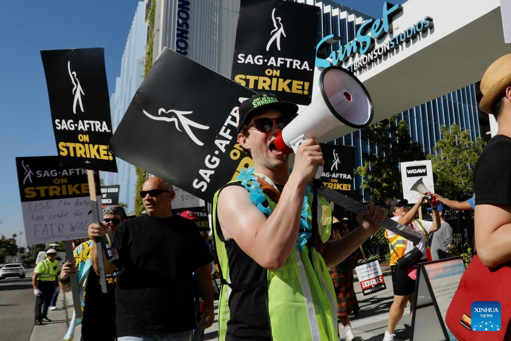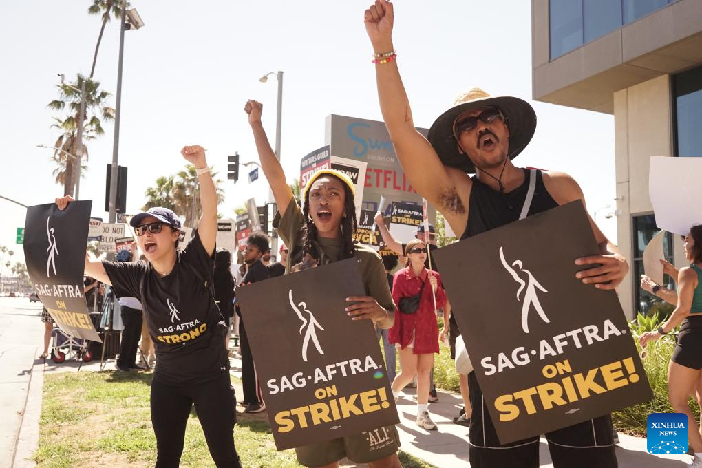Members of the Screen Actors Guild-American Federation of Television and Radio Artists (SAG-AFTRA) demonstrate in Hollywood, Los Angeles, the United States, on July 14, 2023. As Hollywood actors took to the picket lines outside major studios Friday morning, two of Hollywood's most powerful labor unions are striking simultaneously for the first time over 60 years. (Xinhua)