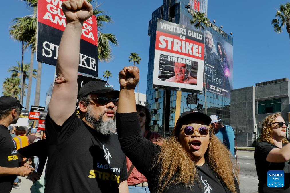 LOS ANGELES, July 14 (Xinhua) -- As Hollywood actors took to the picket lines outside major studios Friday morning, two of Hollywood's most powerful labor unions are striking simultaneously for the first time over 60 years.