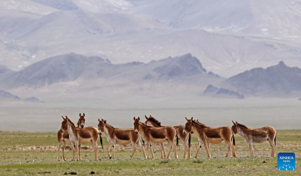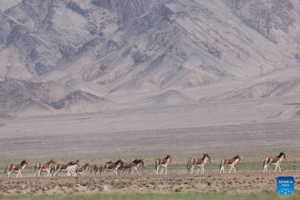 This photo taken on June 30, 2023 shows Tibetan wild donkeys in the Altun Mountains National Nature Reserve in northwest China's Xinjiang Uygur Autonomous Region. (Xinhua/Cai Yang)