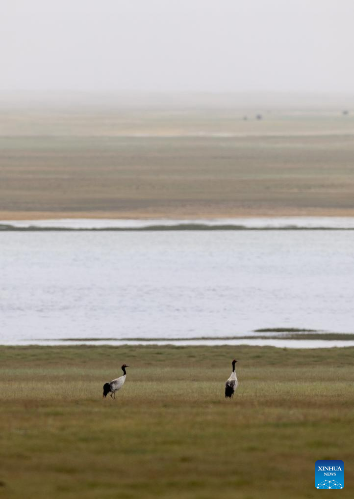 This photo taken on June 30, 2023 shows black-necked cranes in the Altun Mountains National Nature Reserve in northwest China's Xinjiang Uygur Autonomous Region. (Xinhua/Cai Yang)
