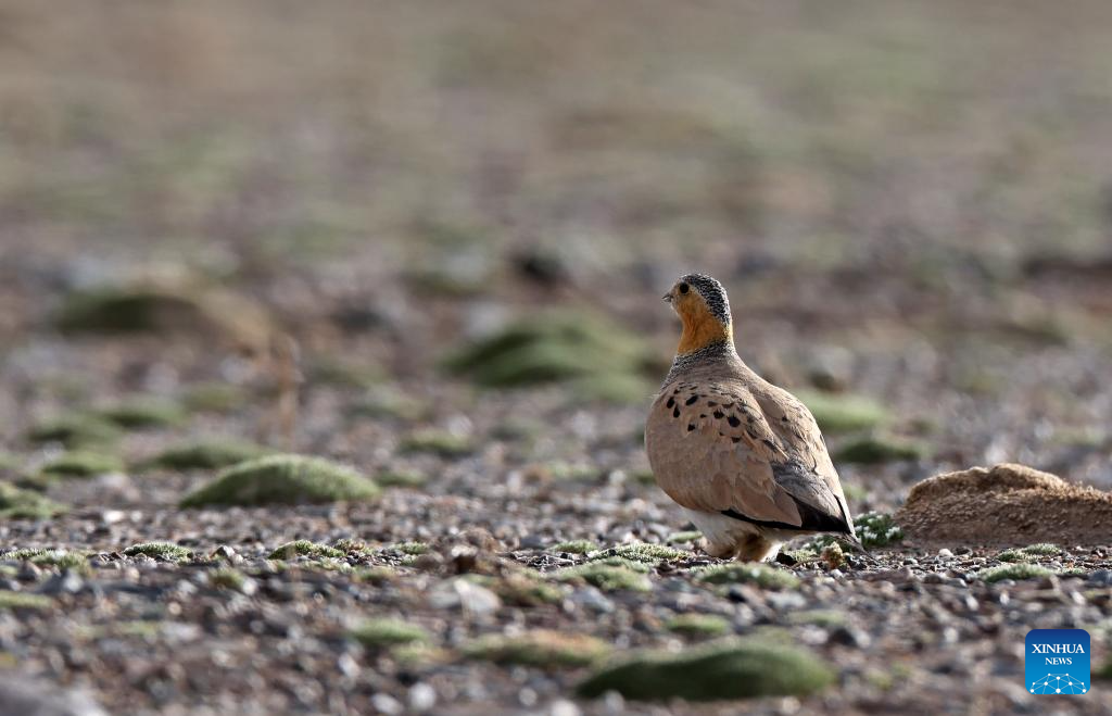 This photo taken on July 9, 2023 shows a Palla's sand grouse (syrrhaptes paradoxus) in the Altun Mountains National Nature Reserve in northwest China's Xinjiang Uygur Autonomous Region. (Xinhua/Wang Peng)