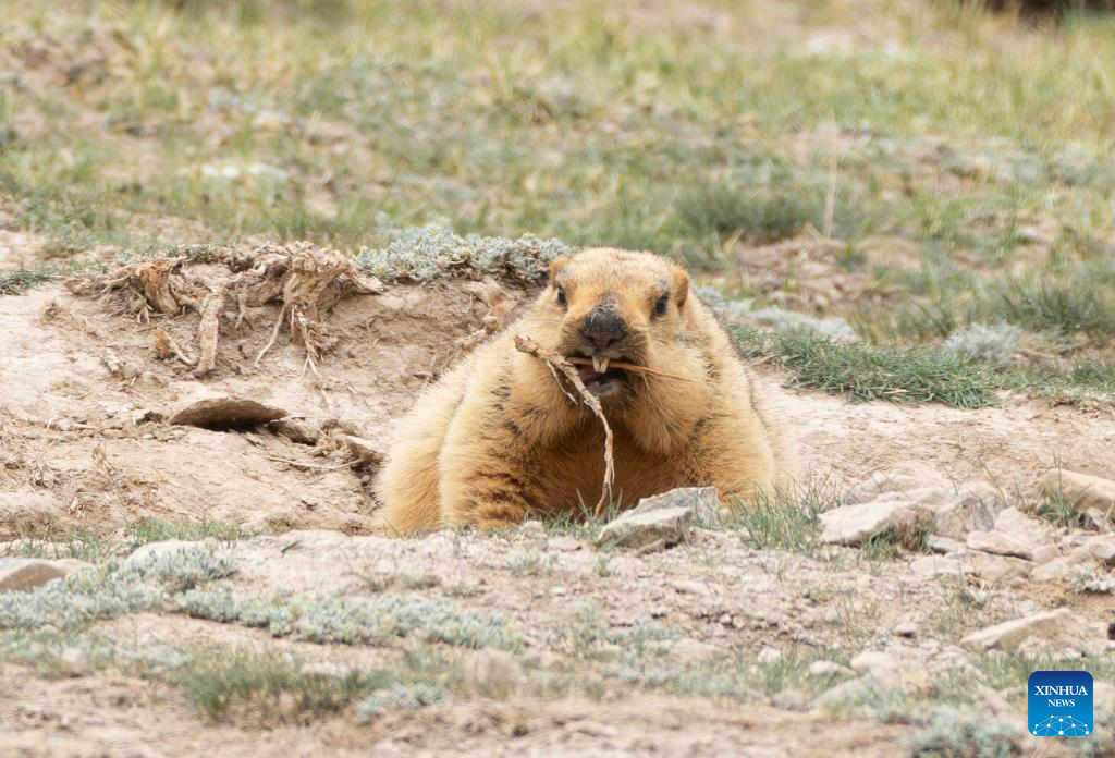 This photo taken on June 30, 2023 shows a Himalayan marmot (Marmota himalayana) in the Altun Mountains National Nature Reserve in northwest China's Xinjiang Uygur Autonomous Region. (Xinhua/Cai Yang)
