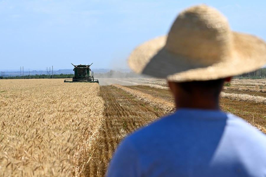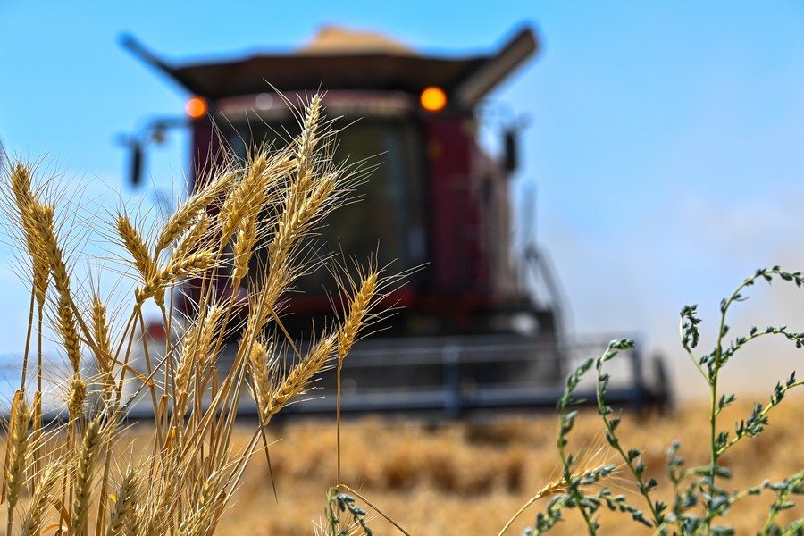 This photo taken on July 15, 2023 shows a farmer harvesting wheat in Hutubi County, northwest China's Xinjiang Uygur Autonomous Region. (Xinhua/Ding Lei)
