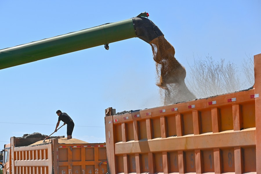 Wheat grains are loaded onto a truck in Hutubi County, northwest China's Xinjiang Uygur Autonomous Region, July 15, 2023. (Xinhua/Ding Lei)