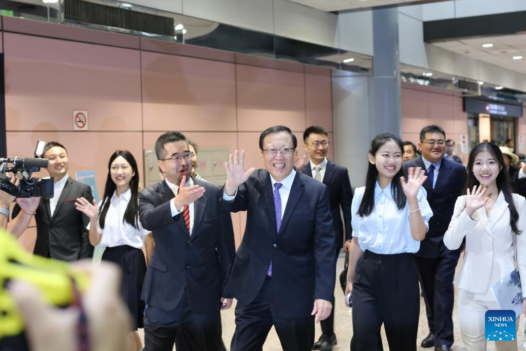 Teachers and students from five mainland universities arrive at the Taoyuan International Airport, southeast China's Taiwan, July 15, 2023. A group of 37 teachers and students from five mainland universities arrived at the Taoyuan International Airport on Saturday, starting a visit to Taiwan for exchanges. (Xinhua/Chen Jun)