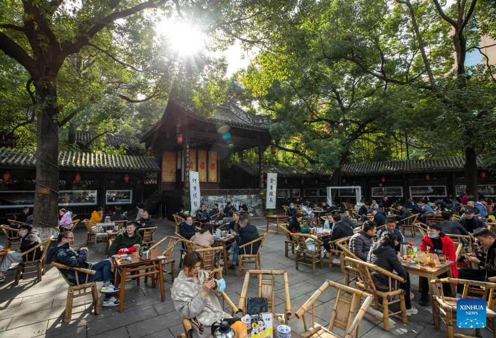People enjoy tea at an open tea house in Chengdu of southwest China's Sichuan Province, on Nov. 23, 2021. The 31st FISU Summer World University Games is scheduled to take place in Chengdu from July 28 to August 8, 2023. (Xinhua/Shen Bohan)