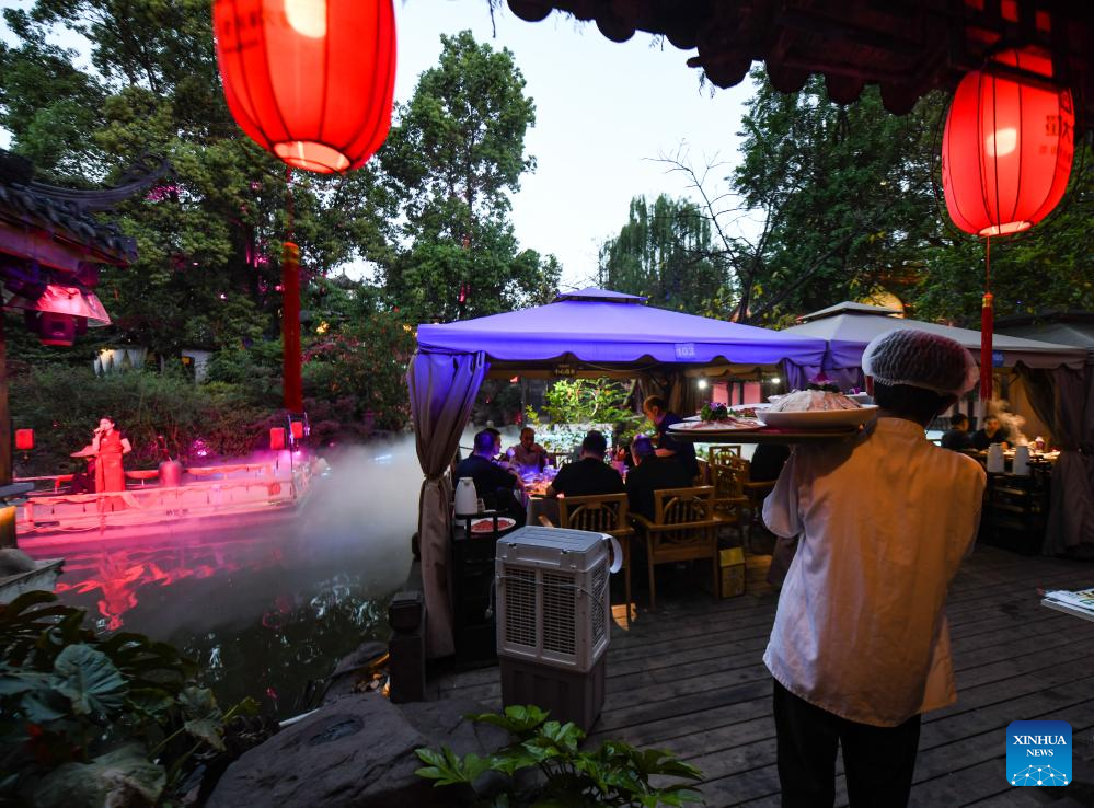 People have dinner at a restaurant in Chengdu of southwest China's Sichuan Province, on July 14, 2023. The 31st FISU Summer World University Games is scheduled to take place in Chengdu from July 28 to August 8, 2023. (Xinhua/Wang Xi)