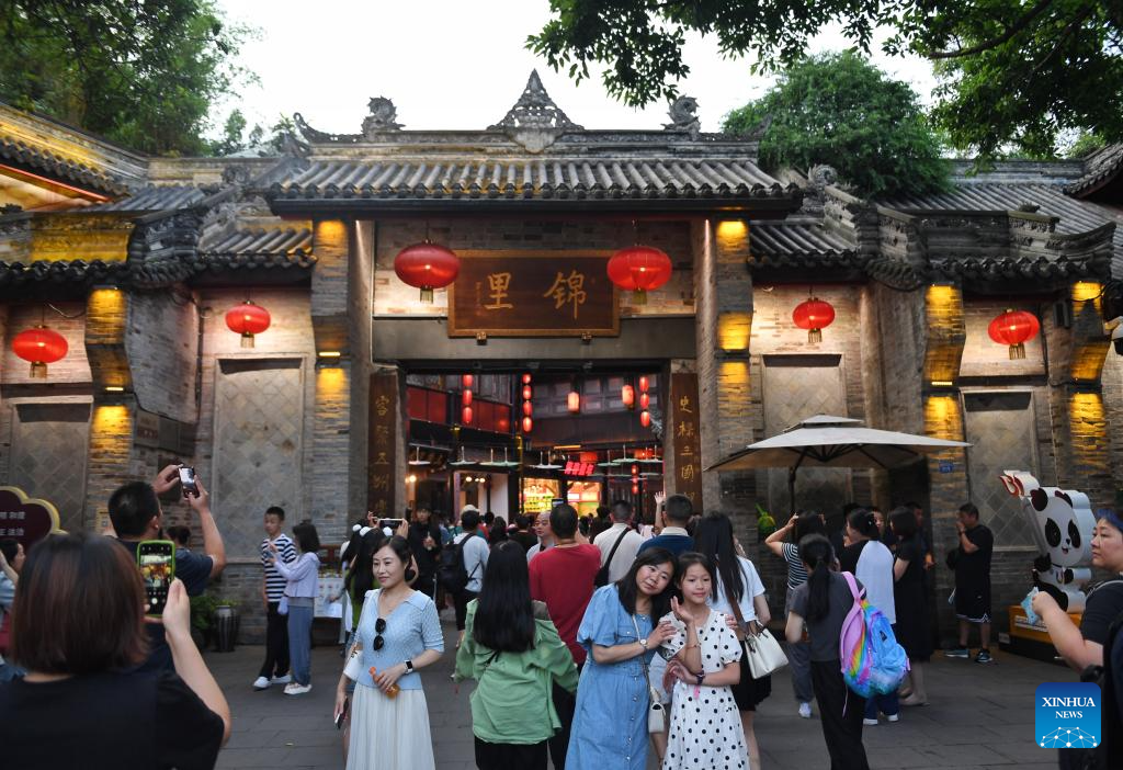 Tourists visit the Jinli folklore street in Chengdu of southwest China's Sichuan Province, on July 14, 2023. The 31st FISU Summer World University Games is scheduled to take place in Chengdu from July 28 to August 8, 2023. (Xinhua/Liu Kun)