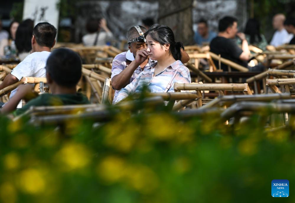 People enjoy tea at an open tea house in Chengdu of southwest China's Sichuan Province, on June 7, 2023. The 31st FISU Summer World University Games is scheduled to take place in Chengdu from July 28 to August 8, 2023. (Xinhua/Shen Bohan)