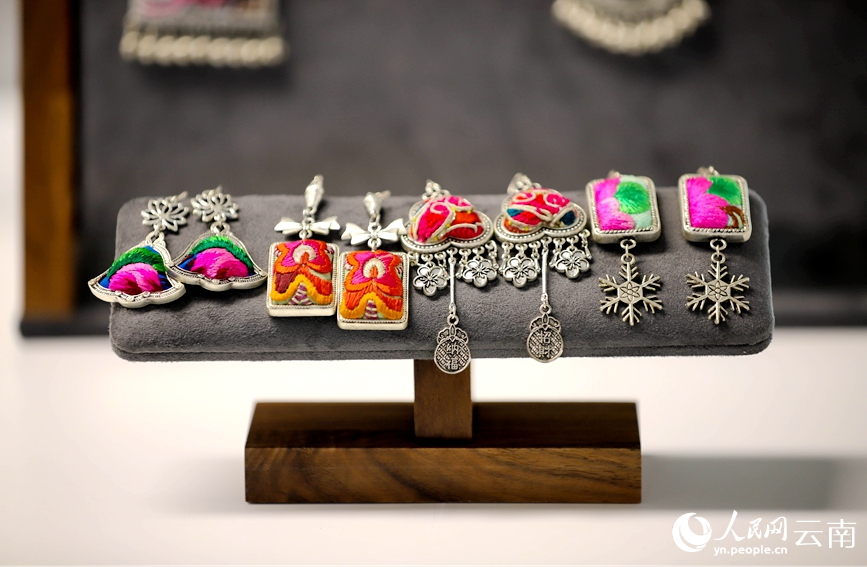 Exquisite Yi embroidered ornaments at an exhibition featuring Yi embroidery in Nanhua county, Chuxiong Yi Autonomous Prefecture, southwest China's Yunnan Province. (People's Daily Online/Hu Zunhui)