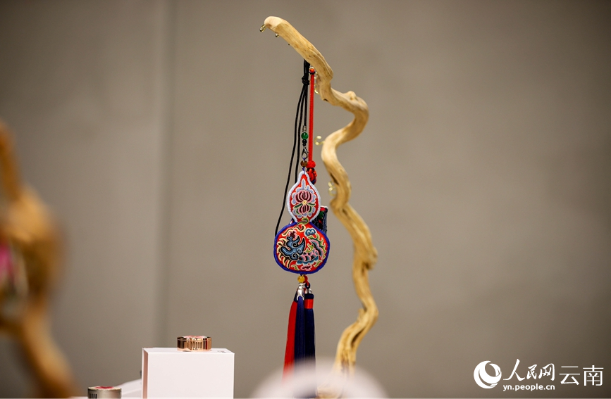 An exquisite Yi embroidered ornament at an exhibition featuring Yi embroidery in Nanhua county, Chuxiong Yi Autonomous Prefecture, southwest China's Yunnan Province. (People's Daily Online/Hu Zunhui)