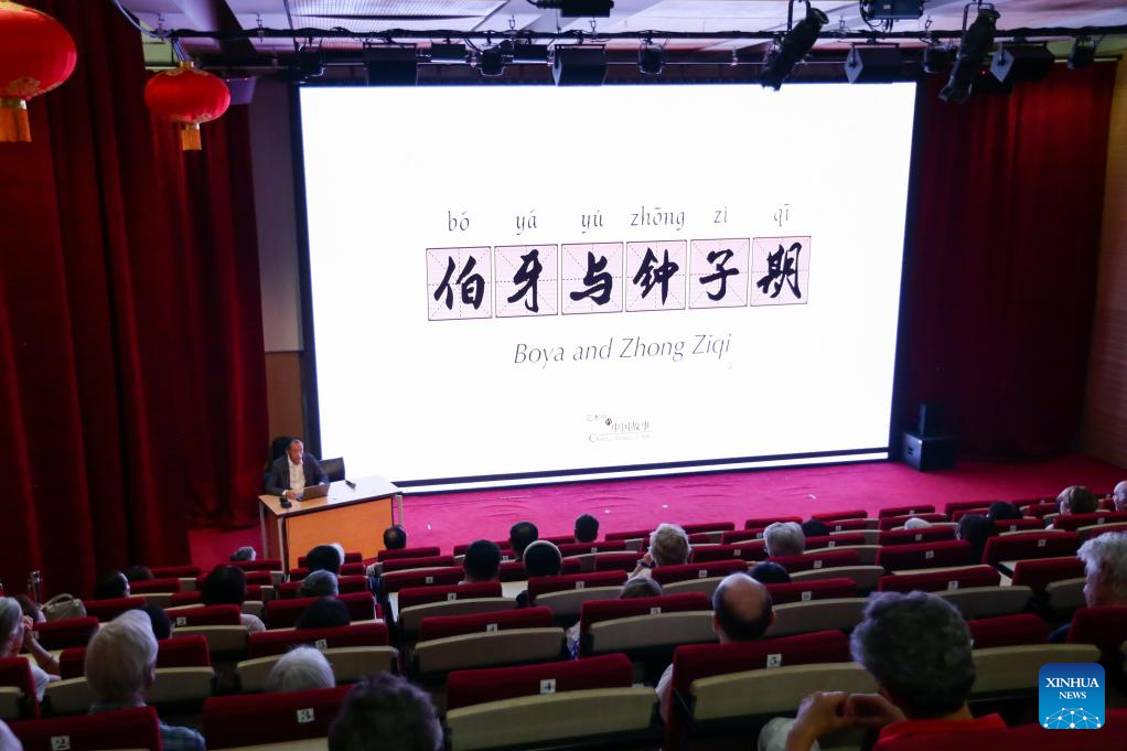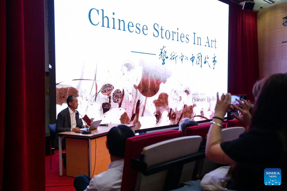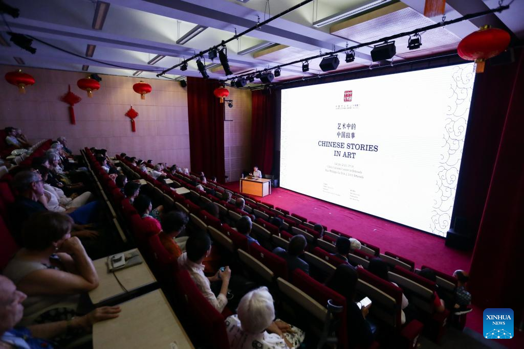 Professor Liu Bo from Chinese National Academy of Arts makes a presentation on Chinese Stories in Art at the China Cultural Center in Brussels, Belgium, July 14, 2023. A Chinese and European cultural dialogue was held here on Friday. (Xinhua/Zheng Huansong)