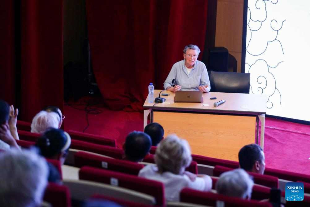 Simone Schuiten, a former professor of an art school in Brussels, shares her understanding on Chinese art at the China Cultural Center in Brussels, Belgium, July 14, 2023. A Chinese and European cultural dialogue was held here on Friday. (Xinhua/Zheng Huansong)