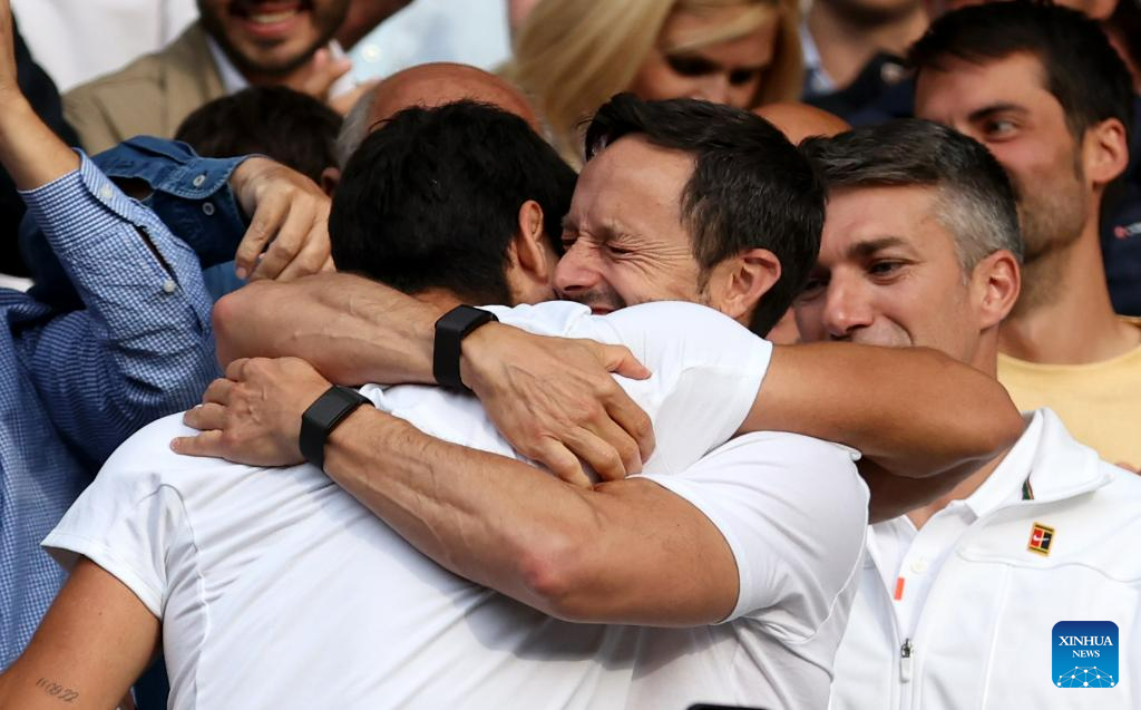 Players greet each other after the men's singles final match between Novak Djokovic of Serbia and Carlos Alcaraz of Spain at Wimbledon Tennis Championships in London, Britain, July 16, 2023. (Xinhua/Li Ying)