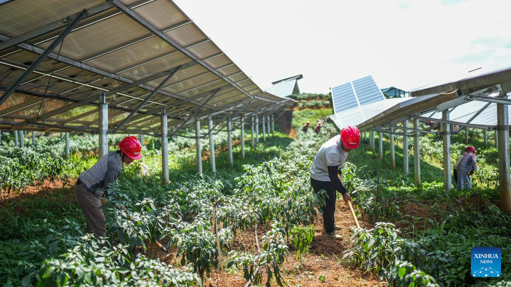 Villagers plant hot peppers under the photovoltaic (PV) panels in Xinqiao Town of Anlong County, southwest China's Guizhou Province, July 5, 2023. (Xinhua/Tao Liang)