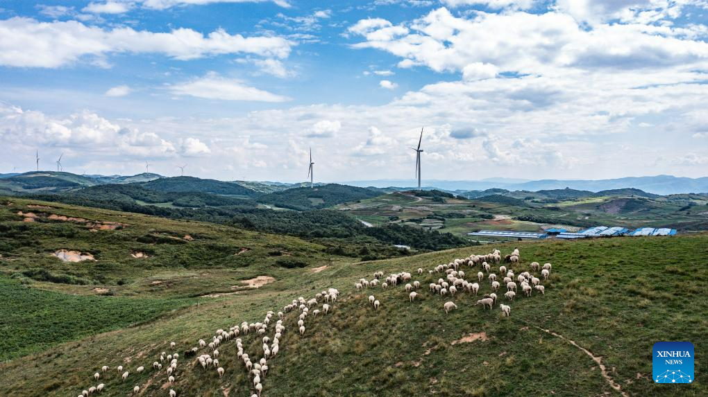 Sheep graze on a grassland under wind power turbines in Xueshan Town of Weining Yi, Hui and Miao Autonomous County in southwest China's Guizhou Province, July 13, 2023. (Xinhua/Tao Liang)