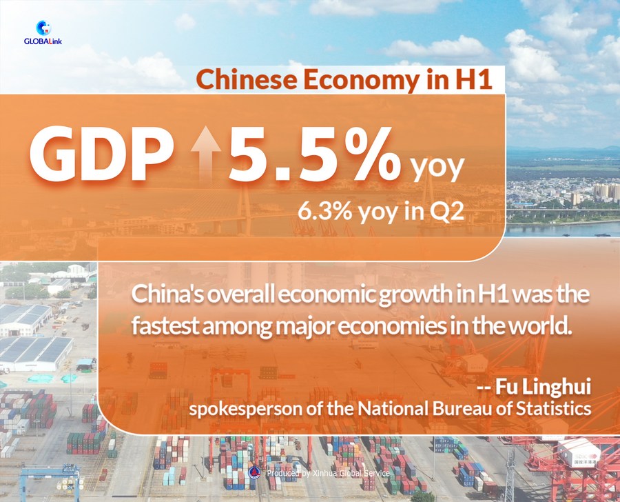 BEIJING, July 17 (Xinhua) -- China's gross domestic product (GDP) grew 5.5 percent year on year in the first half (H1) of 2023, data from the National Bureau of Statistics (NBS) showed Monday.