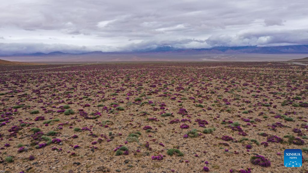 This aerial photo taken on July 11, 2023 shows drought-resistant plants in the Altun Mountains National Nature Reserve in northwest China's Xinjiang Uygur Autonomous Region. With an average altitude of 4,580 meters, the Altun Mountains National Nature Reserve covers a total area of 45,000 square kilometers and is a representative of plateau desert ecosystem in China. (Xinhua/Wang Peng)