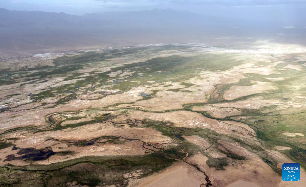 This aerial photo taken on June 30, 2023 shows a wetland in the Altun Mountains National Nature Reserve in northwest China's Xinjiang Uygur Autonomous Region. With an average altitude of 4,580 meters, the Altun Mountains National Nature Reserve covers a total area of 45,000 square kilometers and is a representative of plateau desert ecosystem in China. (Xinhua/Cai Yang)